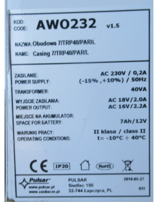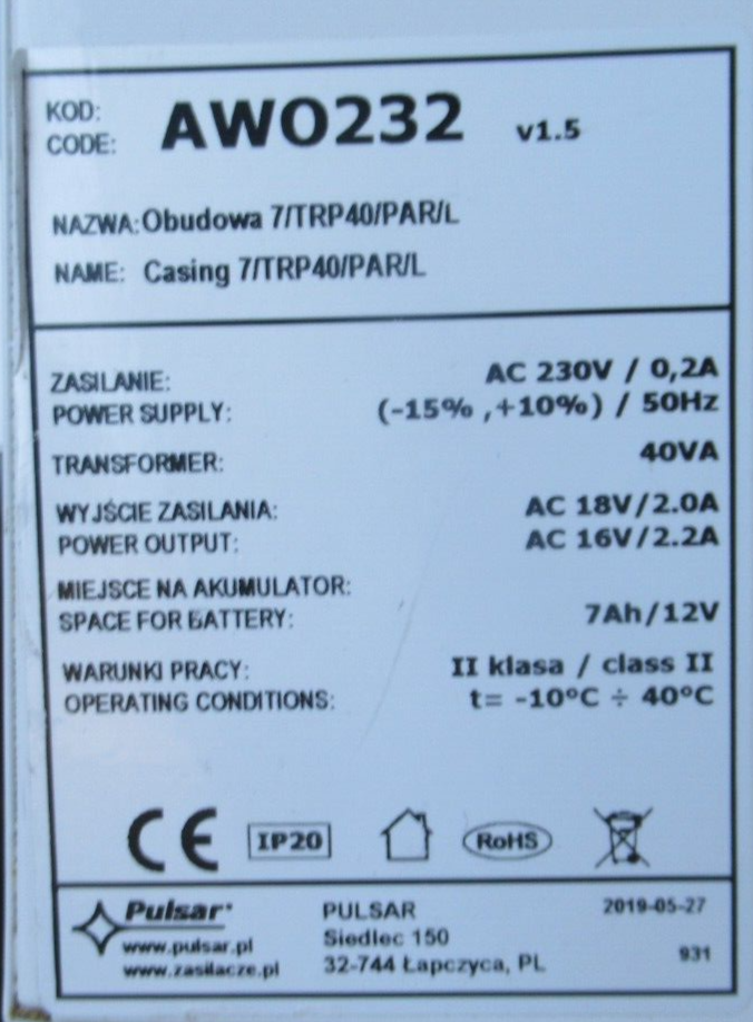 PULSAR 7/TRP40/PAR/L CENTRALE ALARME MODEL: AW0232