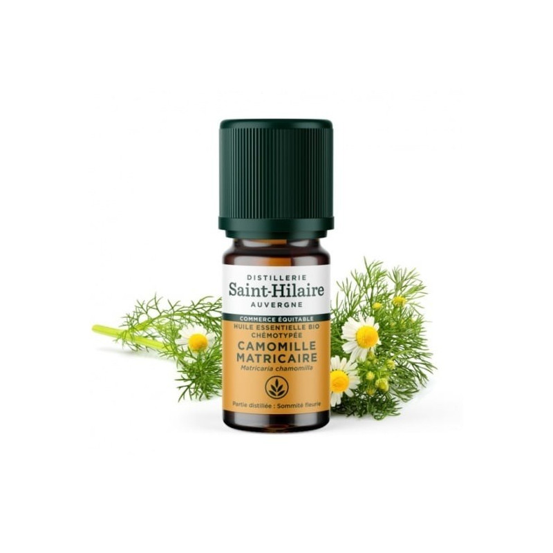 L'huile essentielle biologique de Camomille Matricaire de Saint-Hilaire est connue pour ses vertus anti-inflammatoires et anti-allergiques, recommandée en cas d'inflammation cutanée, du tube digestif ou des voies respiratoires, et elle est aussi utilisée en cas d'allergies cutanées ou saisonnières. En beauté elle est idéale pour les cheveux blonds et blancs.