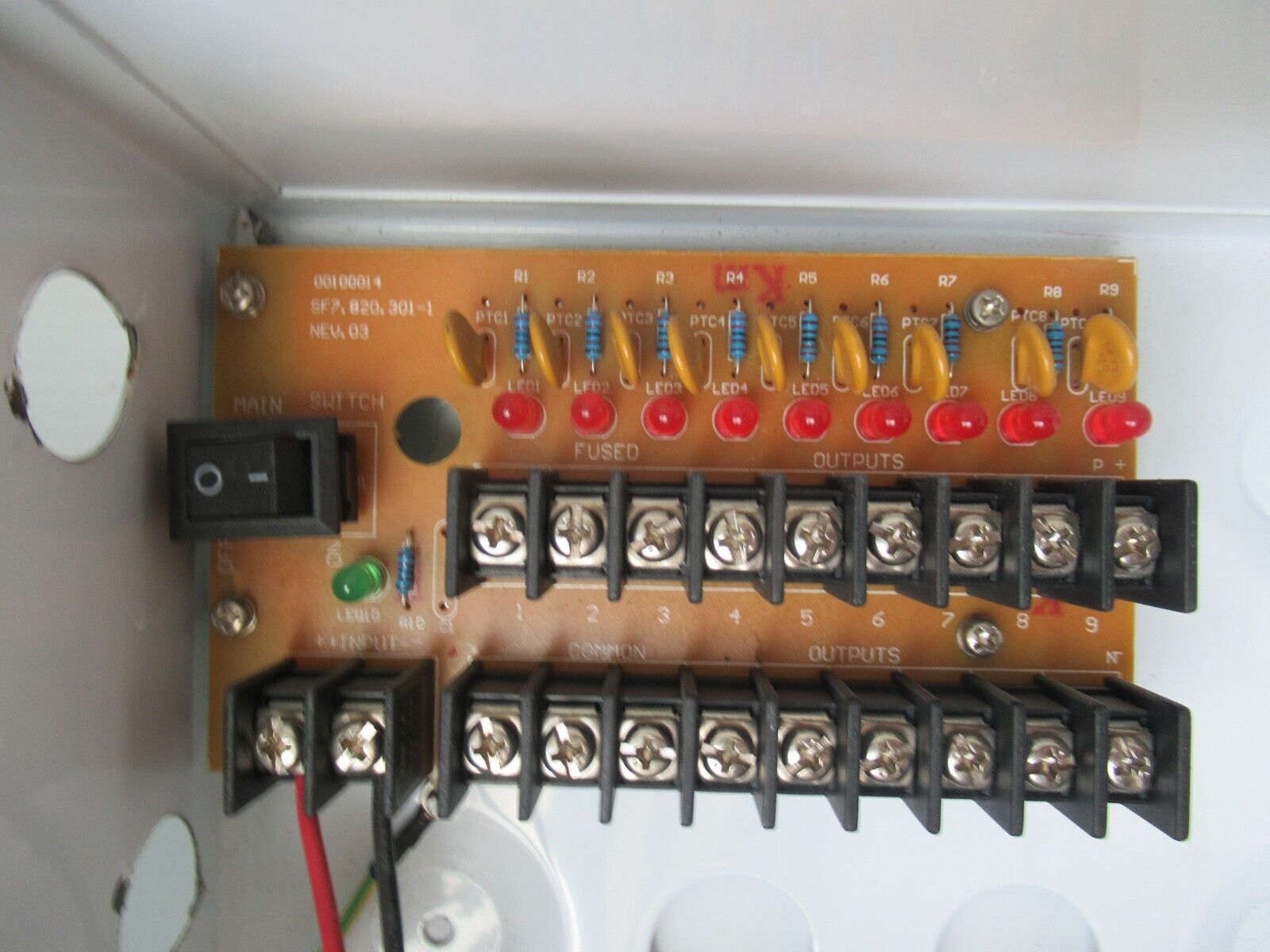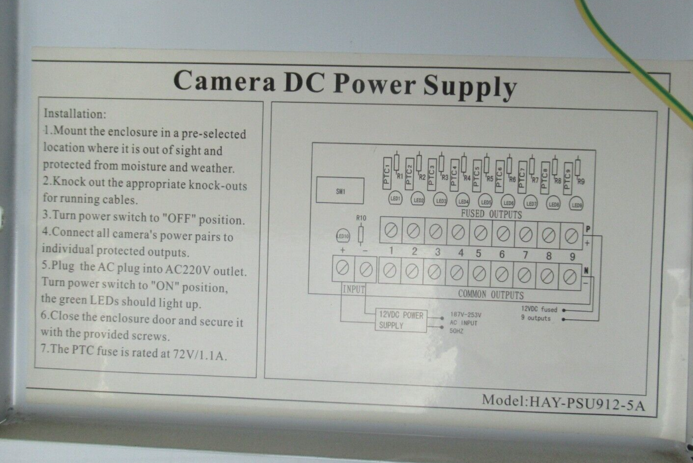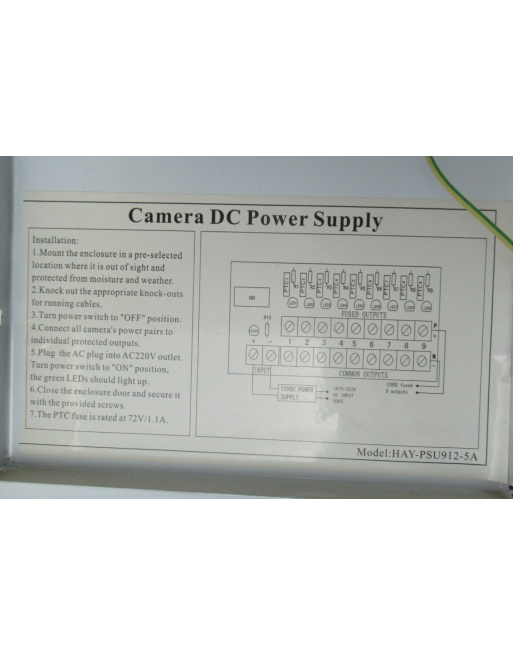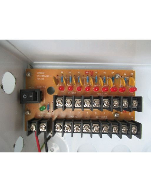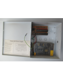- 9 voies, 12VDC 5A en boîte, fusibles PTC, protection contre les surtensions
