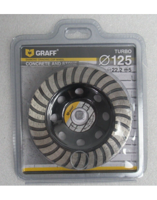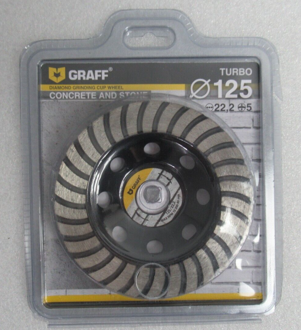 • Matériau adapté – La meule diamantée 125 Graff convient pour le ponçage du béton, du béton légèrement armé, du granit, de la pierre artificielle et naturelle, des plaques de céramique et de pavage. Le disque à ébarber 125 peut être utilisé pour enlever la colle de carrelage.
