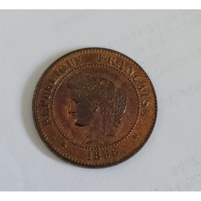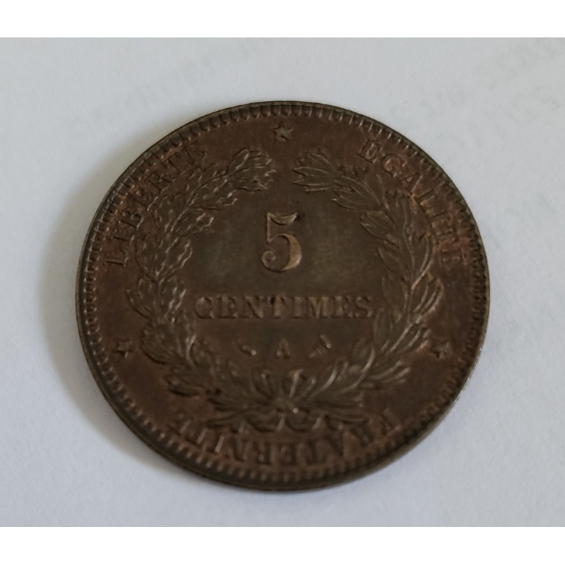 Revers : 5 CENTIMES A dans une couronne formée d’une branche d’olivier et d’une branche de laurier.