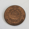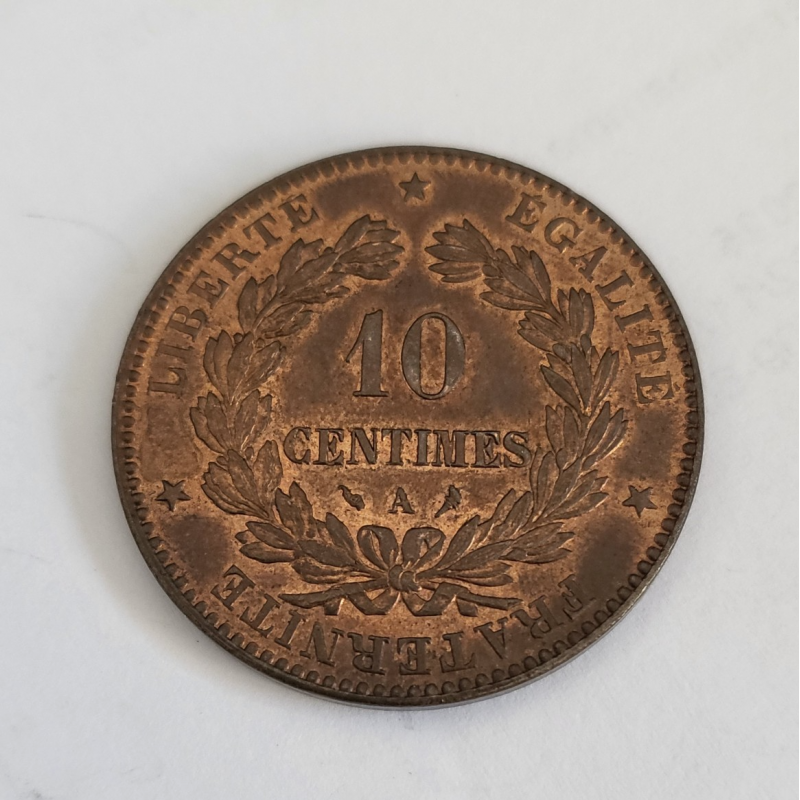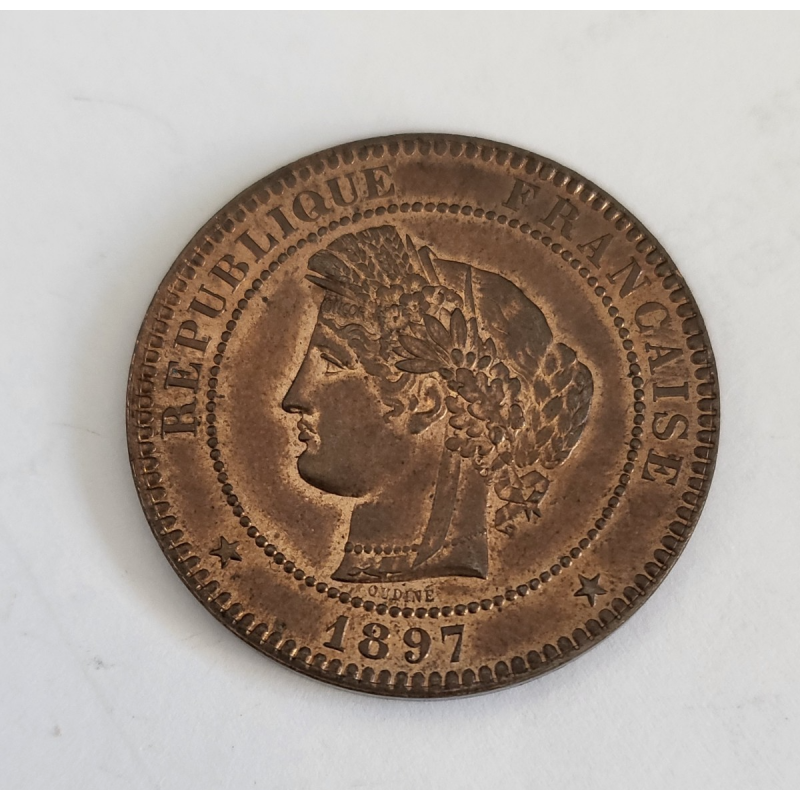Avers : Tête de la République à gauche en Cérès, déesse des moissons, portant un collier de perles, un double chignon et une couronne composite de blé, de fleurs, d'olivier et d'olives, de chêne et de glands, nouée par un ruban descendant sur le cou et passant sur le front où est écrit le mot CONCOR
