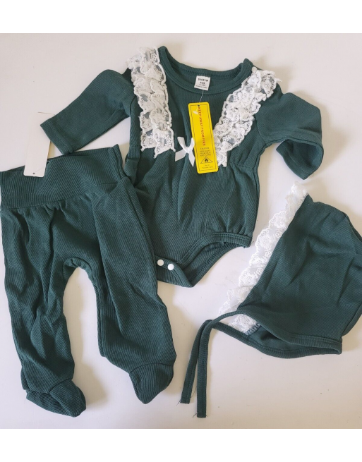 Ensemble body manches longues col rond + legging + bonnet vert Taille 1-3 mois