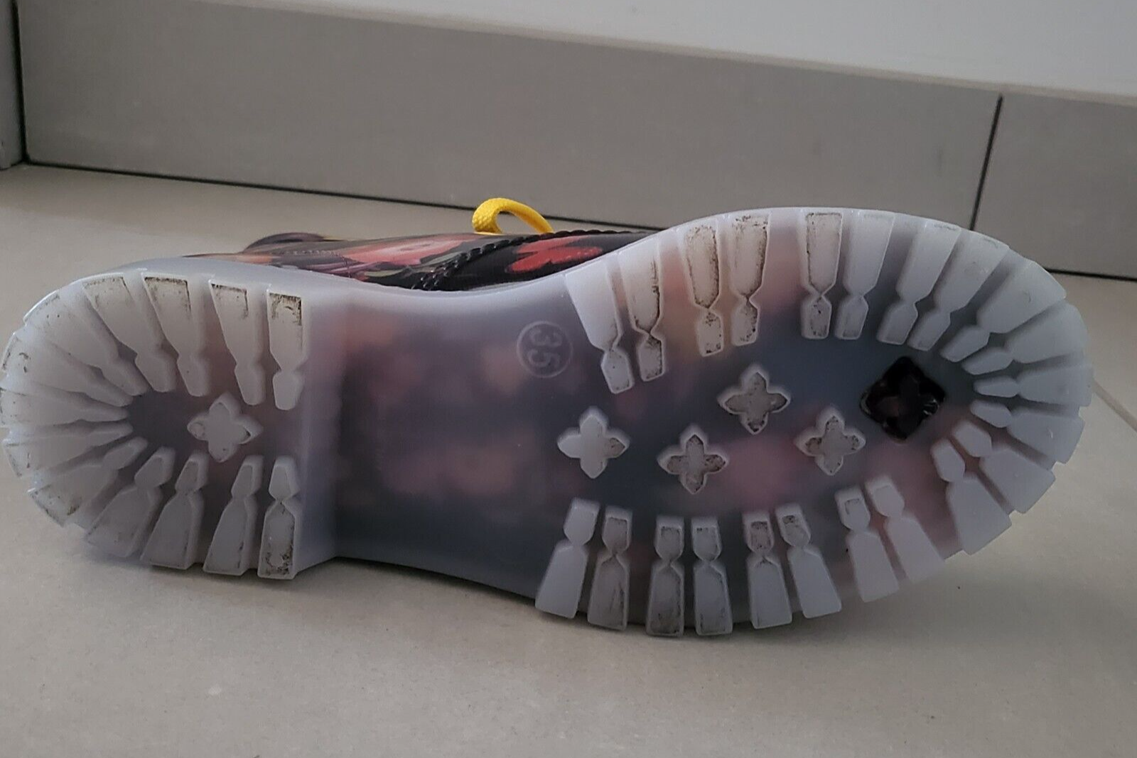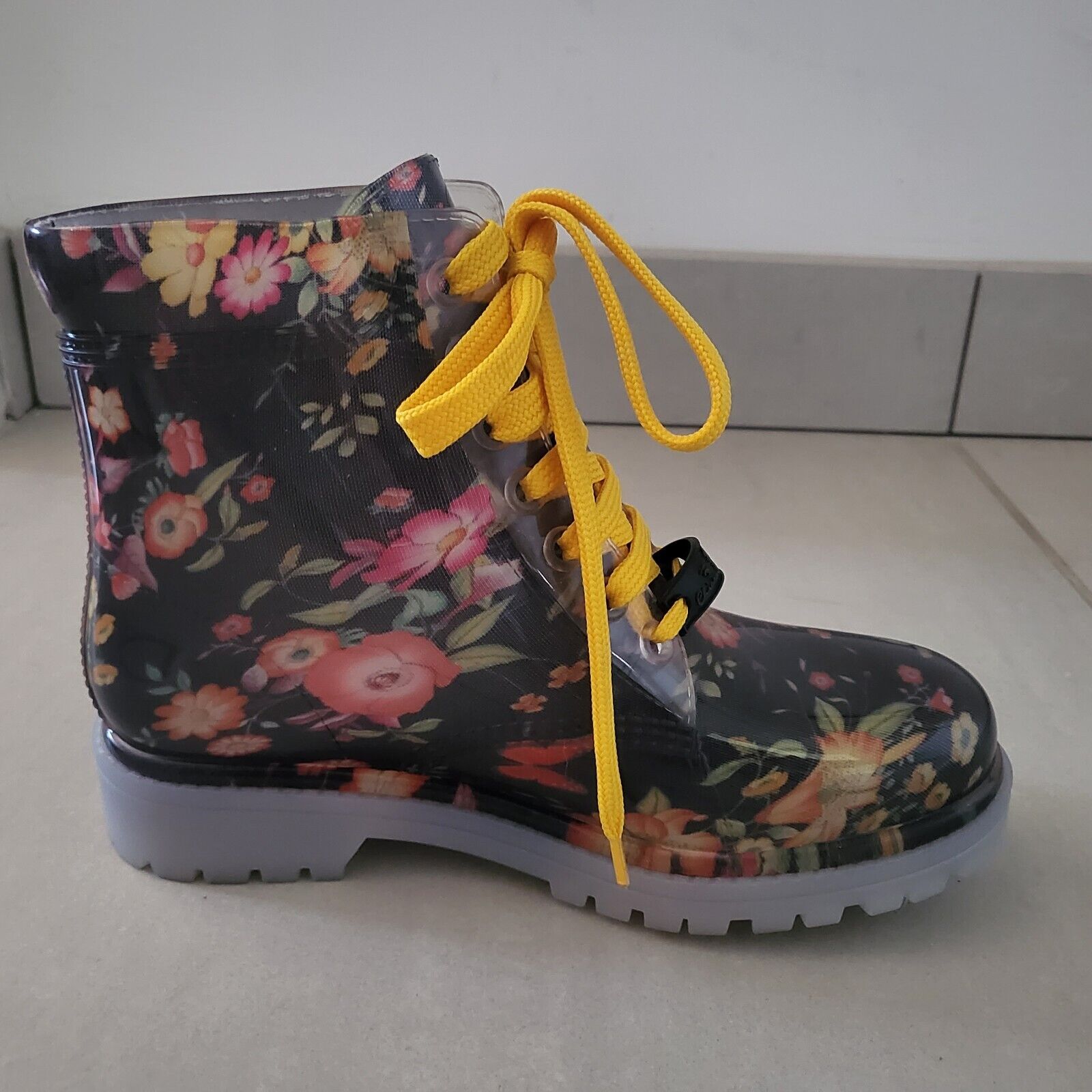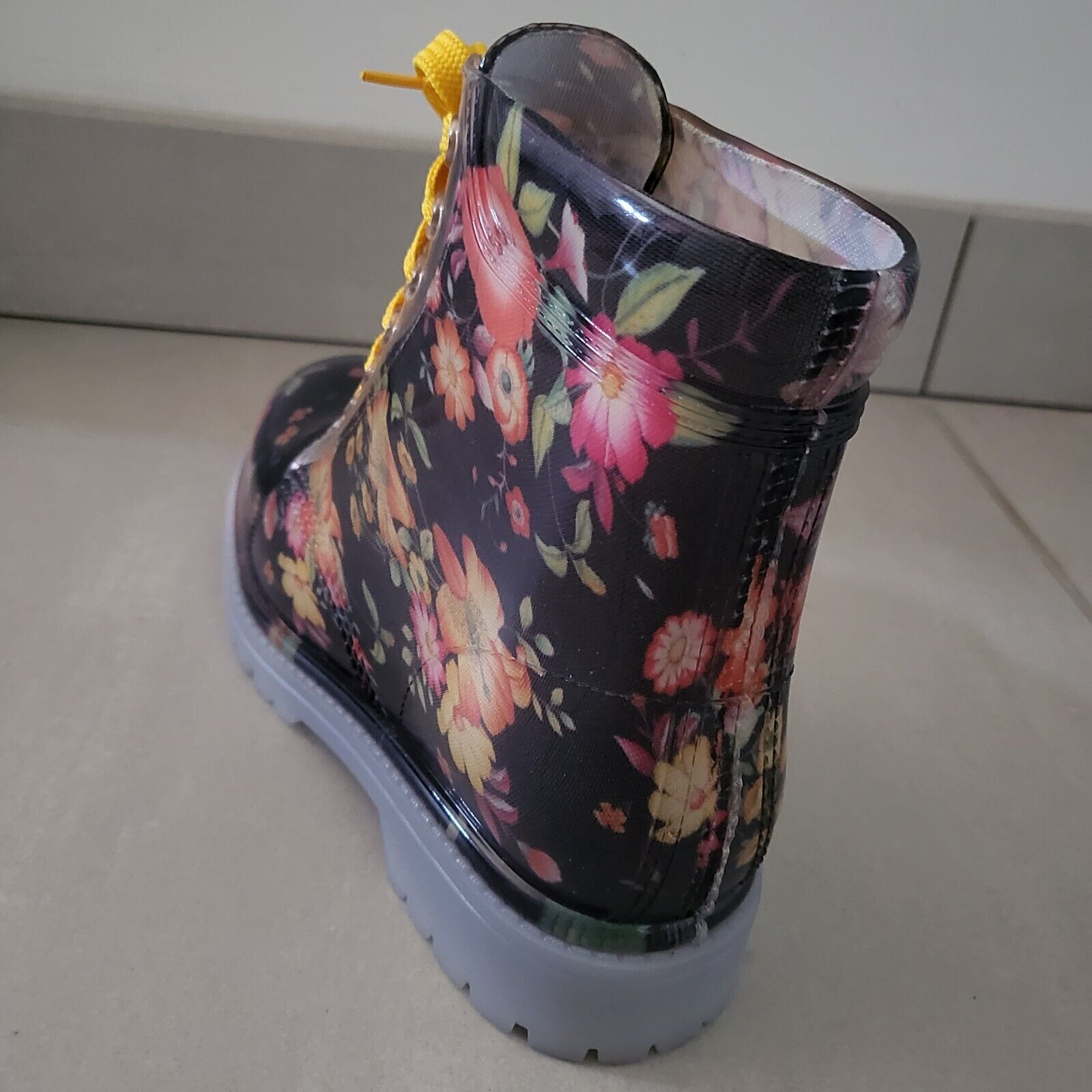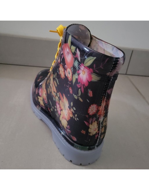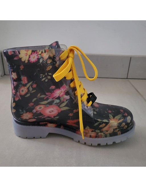 Le motif floral multicolore a un fond noir, la dentelle contrastante est jaune et la semelle est faite d’un PVC transparent.