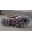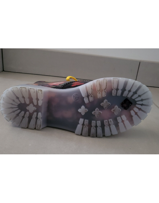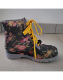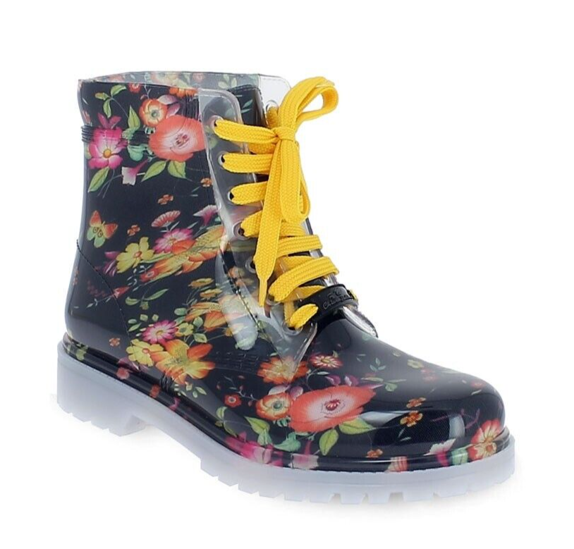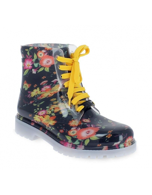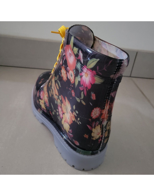La botte inspirée des imprimés floraux des années 70 est réalisée avec un PVC avec une finition brillante et transparente qui vous permet de montrer en entier toute l’impression de la chaussette appliquée pendant la phase de production à l’intérieur de la botte.