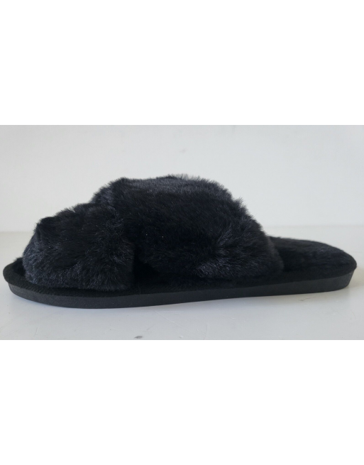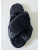 Pantoufles ouvertes fausse fourrure noire talon plat
