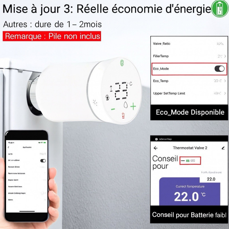 Nouveau mini design, courbe élégante avec une forme d'arc extrêmement gracieuse et une peinture en caoutchouc, se sentant comme une peau de bébé qui s'adapte bien à tous les styles de décoration. Diffère de l'affichage traditionnel d'origine sur le corps de la vanne entraînant des problèmes de lecture depuis la position d'installation, cette nouvelle version est présentée comme un affichage à LED, sans fenêtre et une perspective plus large sur le dessus du couvercle ; deux sections de piles AA alimentées, vanne en coopération avec un radiateur de chauffage pour contrôler la fermeture et l'ouverture du tuyau.