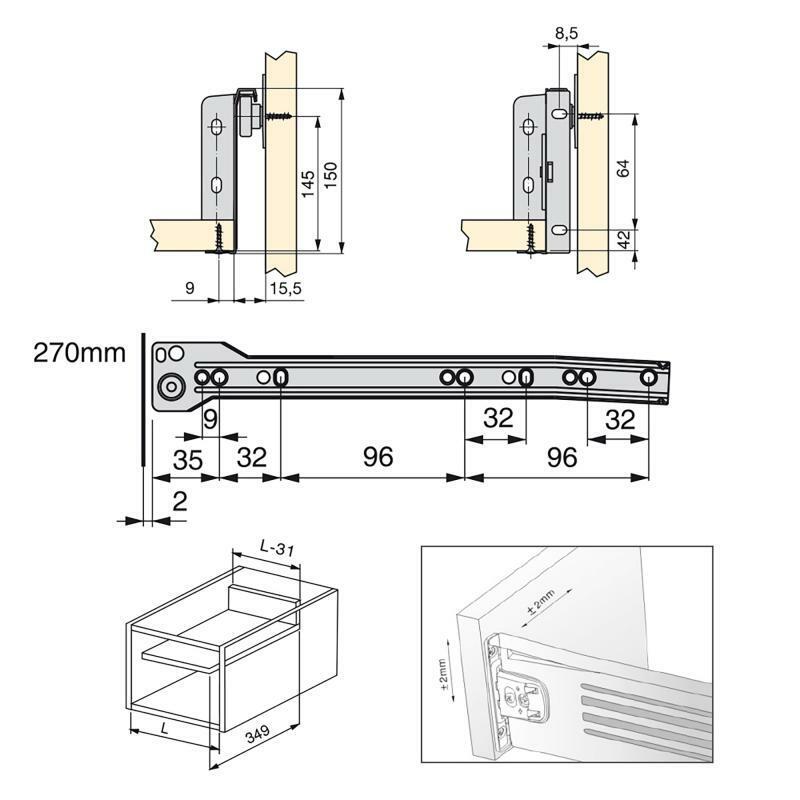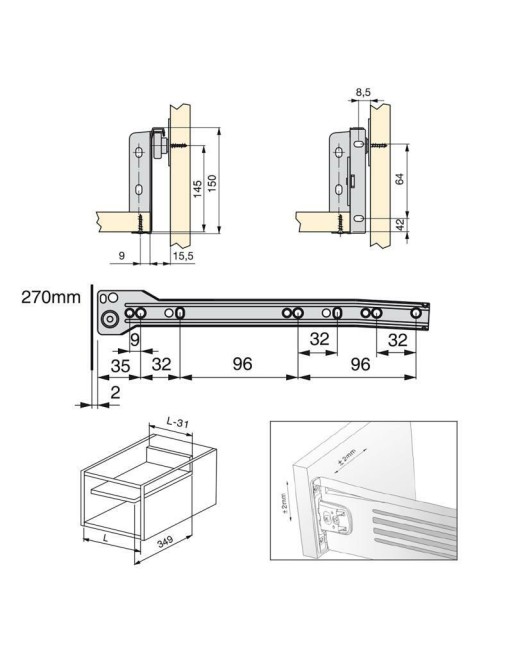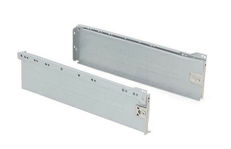 Tiroir Ultrabox pour la cuisine et la salle de bain avec côtés en acier et coulisses à  roulettes en acier finition aluminium peint. Il s'agit de la meilleure option avec le meilleur rapport qualité-prix pour les tiroirs de la cuisine et de la salle de bain. Le kit contient tous les accessoires pour le montage d'un tiroir : côtés, jeu de coulisses et fixations frontales. Les panneaux pour la base, la façade arrière et la façade du tiroir, à  couper aux dimensions correctes, ne sont pas inclus. Fixations frontales fournies sont déjà  montées sur les côtés métallique et permettent un réglage excentrique de ±2 mm à  la verticale.