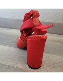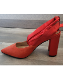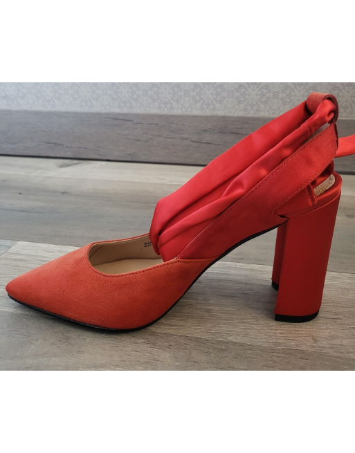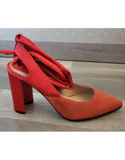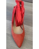 Escarpins daim cuir rouge talon haut cordelette satin rouge