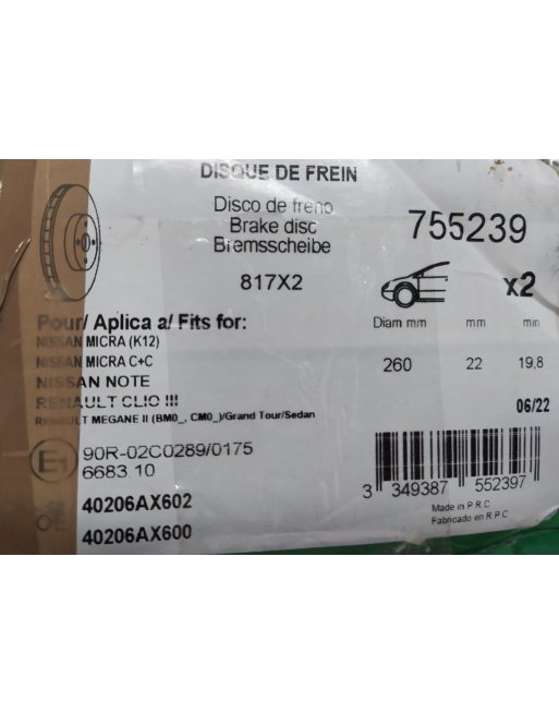 TECHNIKA JEU DE 2 DISQUES DE FREIN AVANT VENTILÉ Ø260 NISSAN / RENAULT