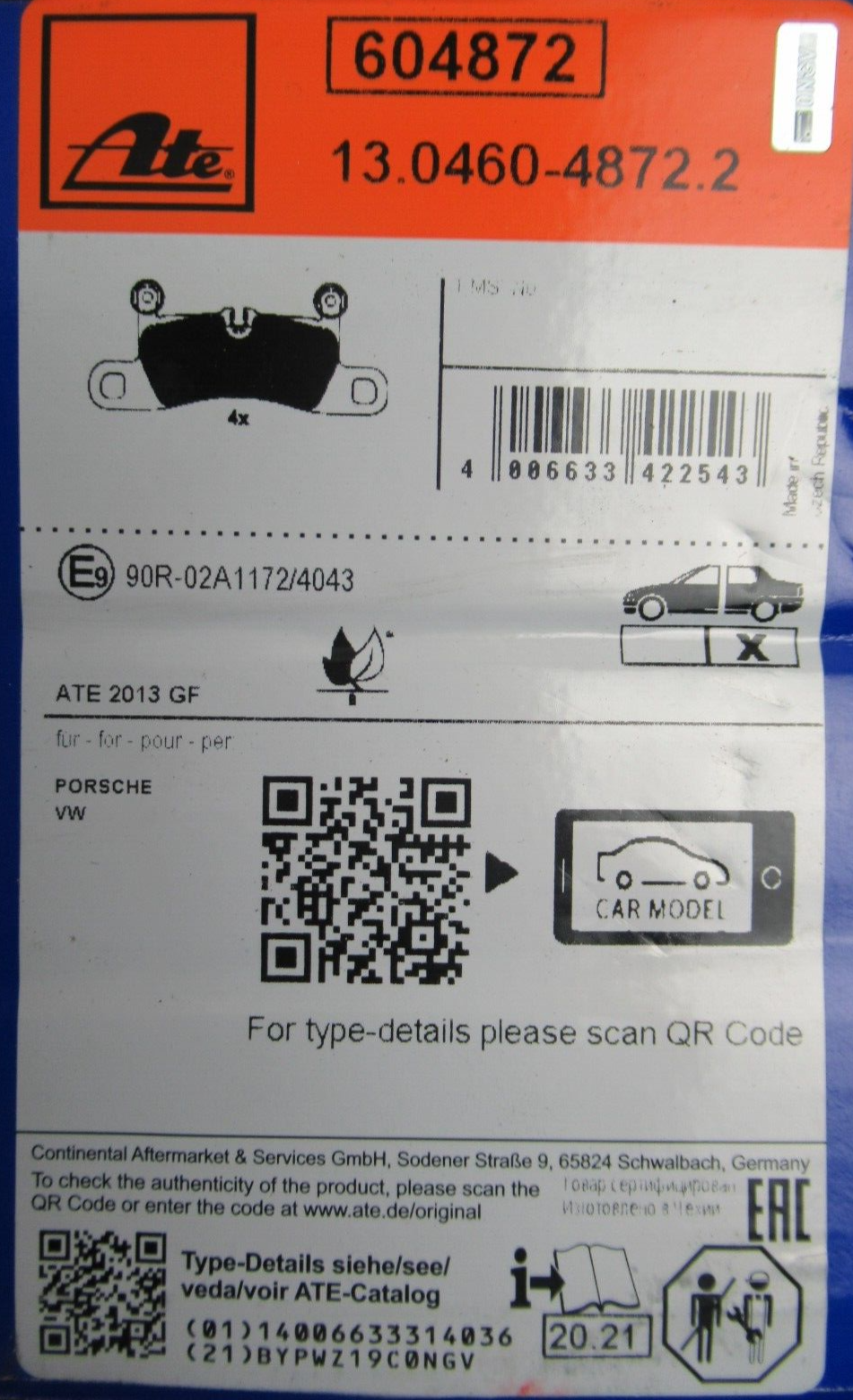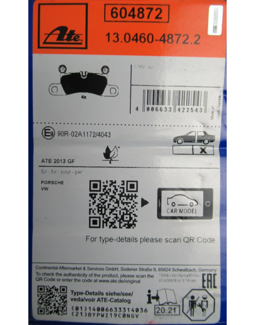 ATE 13.0460-4872.2 JEU DE PLAQUETTES DE FREIN POUR PORSCHE VW