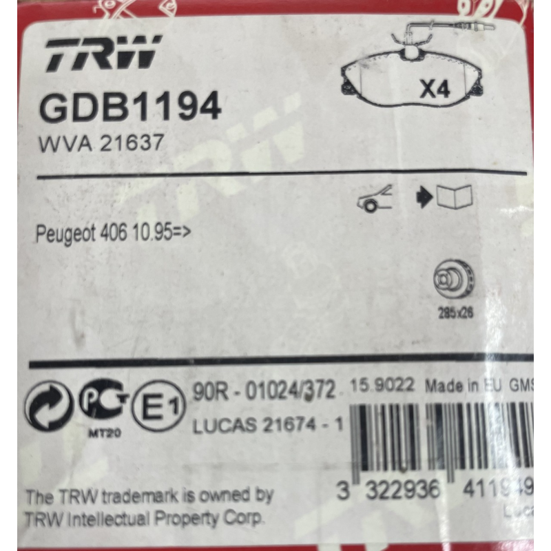 Kit de plaquettes de frein, frein à disque GDB1194 TRW pour PEUGEOT