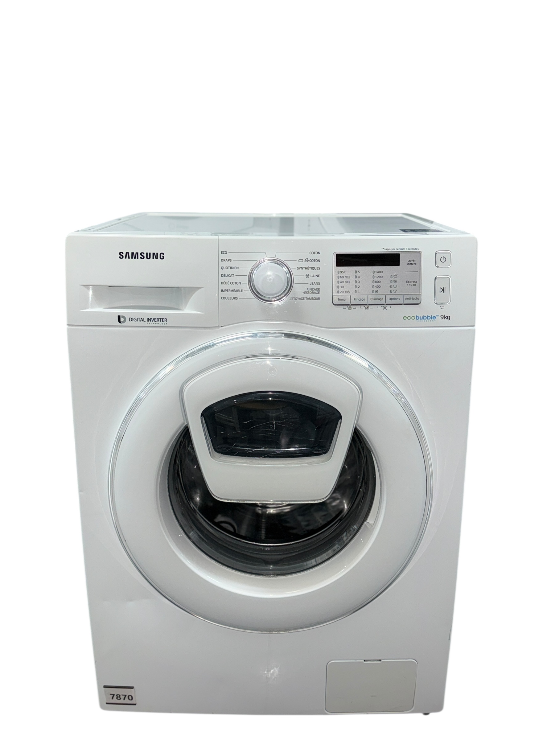 Lave-linge Samsung WW90K5413WW – Capacité 9 kg & essorage jusqu’à 1400 tours/min 🧺✨ Découvrez ce modèle disponible chez Maxdeal, reconditionné et garanti 1 an ! Optez pour ce lave-linge frontal Samsung WW90K5413WW, un appareil haut de gamme avec technologie “Add Wash™” pour plus de flexibilité.  Caractéristiques principales : • 🔘 Capacité : 9 kg – idéal pour une famille ou usage intensif.  • 💨 Essorage maximum : jusqu’à 1400 tours/min – un linge plus sec et prêt à sécher.  • ⚙️ Technologie clé : Add Wash™ – possibilité d’ajouter du linge après le démarrage du cycle.  • 📏 Dimensions approximatives : hauteur ~85 cm, largeur ~60 cm, profondeur ~55 cm.  • 💡 Points à noter : Technologie EcoBubble™ assurant un lavage efficace à basse température, moteur Digital Inverter pour silence et durabilité.  🔒 Garantie : 1 an État : Reconditionné – testé, vérifié, prêt à l’emploi. 🧩 Tous nos appareils électroménagers sont reconditionnés : ils peuvent présenter quelques légers défauts esthétiques (micro-rayures, petites marques ou légers coups), sans aucune incidence sur leur bon fonctionnement ni leurs performances. REF : LLH7870