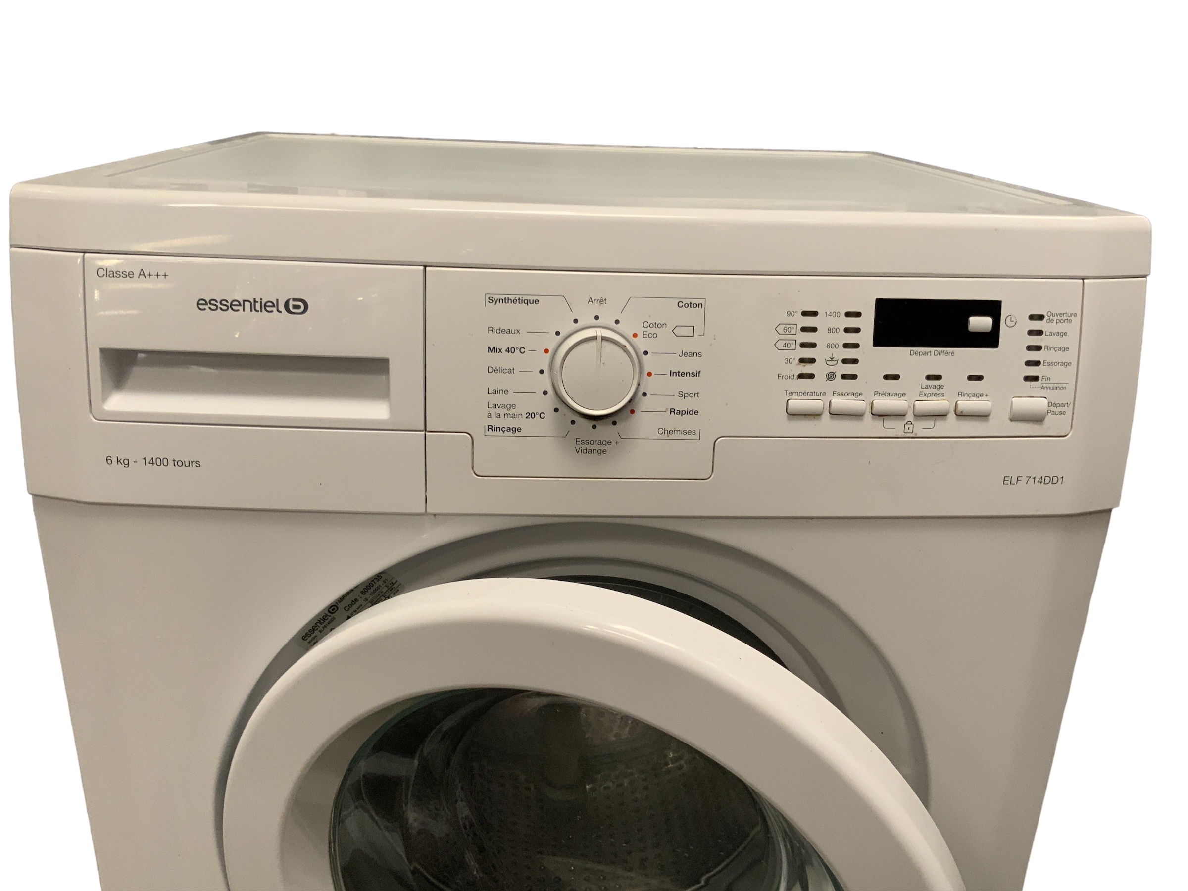 lave-linge ESSENTIELB ELF 614DD2 Lave-linge en pose libre Chargement frontal (Hublot) Capacité de 6 kg Vitesse d'essorage max de 1400 tr/min Confort : Démarrage différé 19h Niveau sonore max : 75 dB Classe énergie : A+++