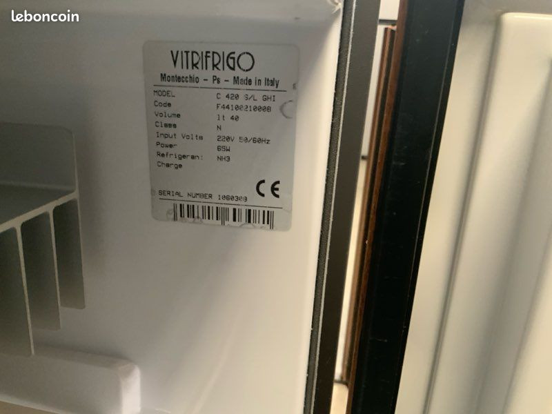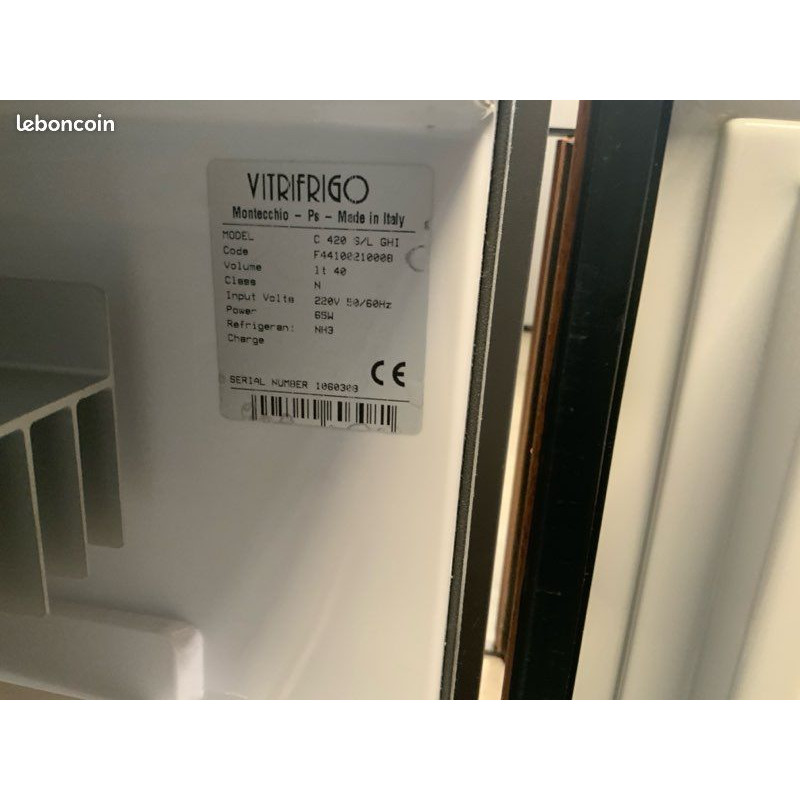 🧊 Minibar professionnel Vitrifrigo, modèle C 420 S/L GHI, fabriqué en Italie 🇮🇹 Idéal pour hôtels, bureaux, chambres d’amis, camping-cars, studios, etc. Fonctionnement silencieux grâce à la technologie à absorption (NH3). 🔹 Volume : 40 litres 🔹 Tension : 220V – 50/60Hz 🔹 Puissance : 65W 🔹 Réfrigérant : NH3 (ammoniac) 🔹 Classe climatique : N 🔹 Fabrication : Montecchio – Italie 🔹 Consommation faible – parfait pour une utilisation continue 📦 Format compact – s’intègre facilement en pose libre ou encastré 🔧 État : Reconditionné – testé, vérifié, prêt à l’emploi 🔁 Porte réversible