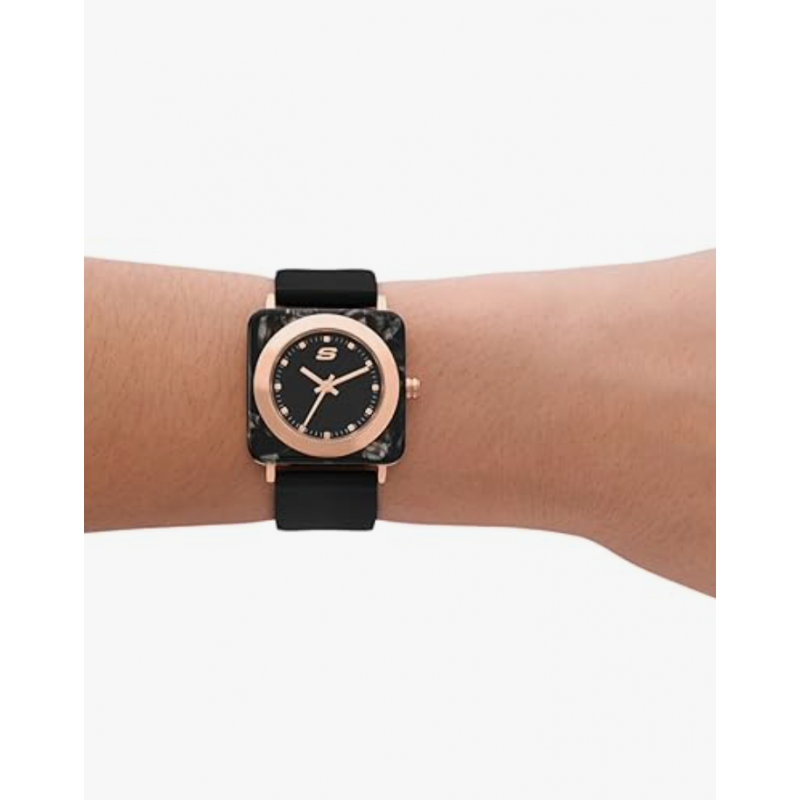 La montre Skechers Calabar dispose d'un boîtier carré chic en plastique noir de 32 mm avec des détails or rose et un bracelet en silicone noir assorti. Cette montre à quartz analogique à trois aiguilles a à la fois un style décontracté et une personnalité qui lui convient.