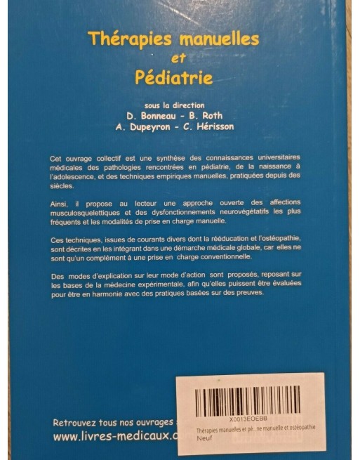 Cet ouvrage collectif est une synthèse des connaissances universitaires médicales des pathologies rencontrées en pédiatrie, de la naissance à l'adolescence, et des techniques empiriques manuelles, pratiquées depuis des siècles. Ainsi, il propose au lecteur une approche ouverte des affections musculosquelettiques et des dysfonctionnements neurovégétatifs les plus fréquents et les modalités de prise en charge manuelle.