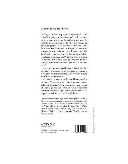 Ici, chacun a fait sa guerre (Viêtnam, Irak) et chacun l'a perdue. Trimballe sa dose de choc post-traumatique, sa propre couleur d'inadaptation à la vie "normale". Au coeur de ce trio, indéchiffrable et silencieux, Hoyt Stapleton voyage dans les livres et dans le temps, à la reconquête patiente et défiante d'une mémoire muette, d'un langage du souvenir. A travers la détresse calme de ce vieil homme-enfant en cours d'évaporation arpentant les grands espaces de l'oubli, Christian Garcin signe un envoûtant roman américain qui fait cohabiter fantômes et réalisme, sourire et mélancolie, ligne claire et foisonnement.