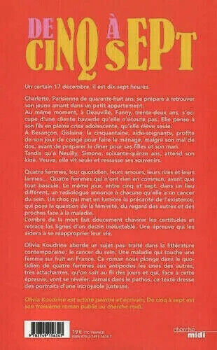 Tandis qu'à Neuilly, Simone, soixante-quinze ans, attend son kiné. Veuve, elle vit seule et ressasse ses souvenirs. Quatre femmes, leur quotidien, leurs amours, leurs rires et leurs larmes... Quatre femmes qui n'ont rien en commun, avant que tout bascule. Le même jour, entre cinq et sept, dans un lieu différent, un radiologue annonce à chacune qu'elle a un cancer du sein. Un choc qui met en lumière la précarité de l'existence, qui pose la question de la féminité, du regard des autres et des proches face à la maladie.