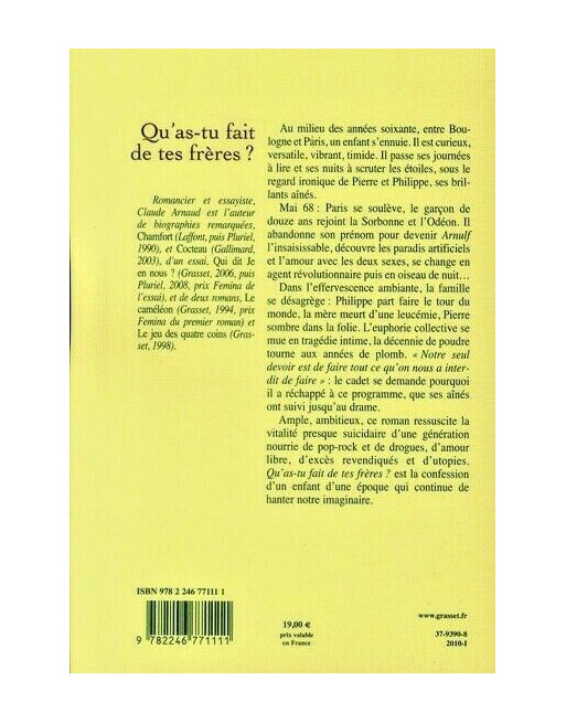 Au milieu des années soixante, entre Boulogne et Paris, un enfant s'ennuie. Il est curieux, versatile, vibrant, timide. Il passe ses journées à lire et ses nuits à scruter les étoiles, sous le regard ironique de Pierre et Philippe, ses brillants aînés. Mai 68 : Paris se soulève, le garçon de douze ans rejoint la Sorbonne et l'Odéon. Il abandonne son prénom pour devenir Arnulf l'insaisissable, découvre les paradis artificiels et l'amour avec les deux sexes, se change en agent révolutionnaire puis en oiseau de nuit... Dans l'effervescence ambiante, la famille se désagrège : Philippe part faire le tour du monde, la mère meurt d'une leucémie, Pierre sombre dans la folie. L'euphorie collective se mue en tragédie intime, la décennie de poudre tourne aux années de plomb. " Notre seul devoir est de faire tout ce qu'on nous a interdit de faire " : le cadet se demande pourquoi il a réchappé à ce programme, que ses aînés ont suivi jusqu'au drame. Ample, ambitieux, ce roman ressuscite la vitalité presque suicidaire d'une génération nourrie de pop-rock et de drogues, d'amour libre, d'excès revendiqués et d'utopies. Qu'as-tu fait de tes frères ? est la confession d'un enfant d'une époque qui continue de hanter notre imaginaire.