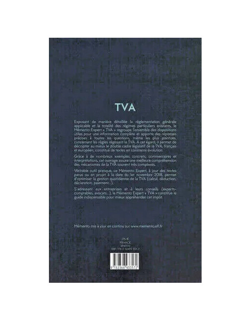 leurs conseils (experts-comptables, avocats...), le Mémento Expert " TVA " constitue le guide indispensable pour mieux appréhender cet impôt.
