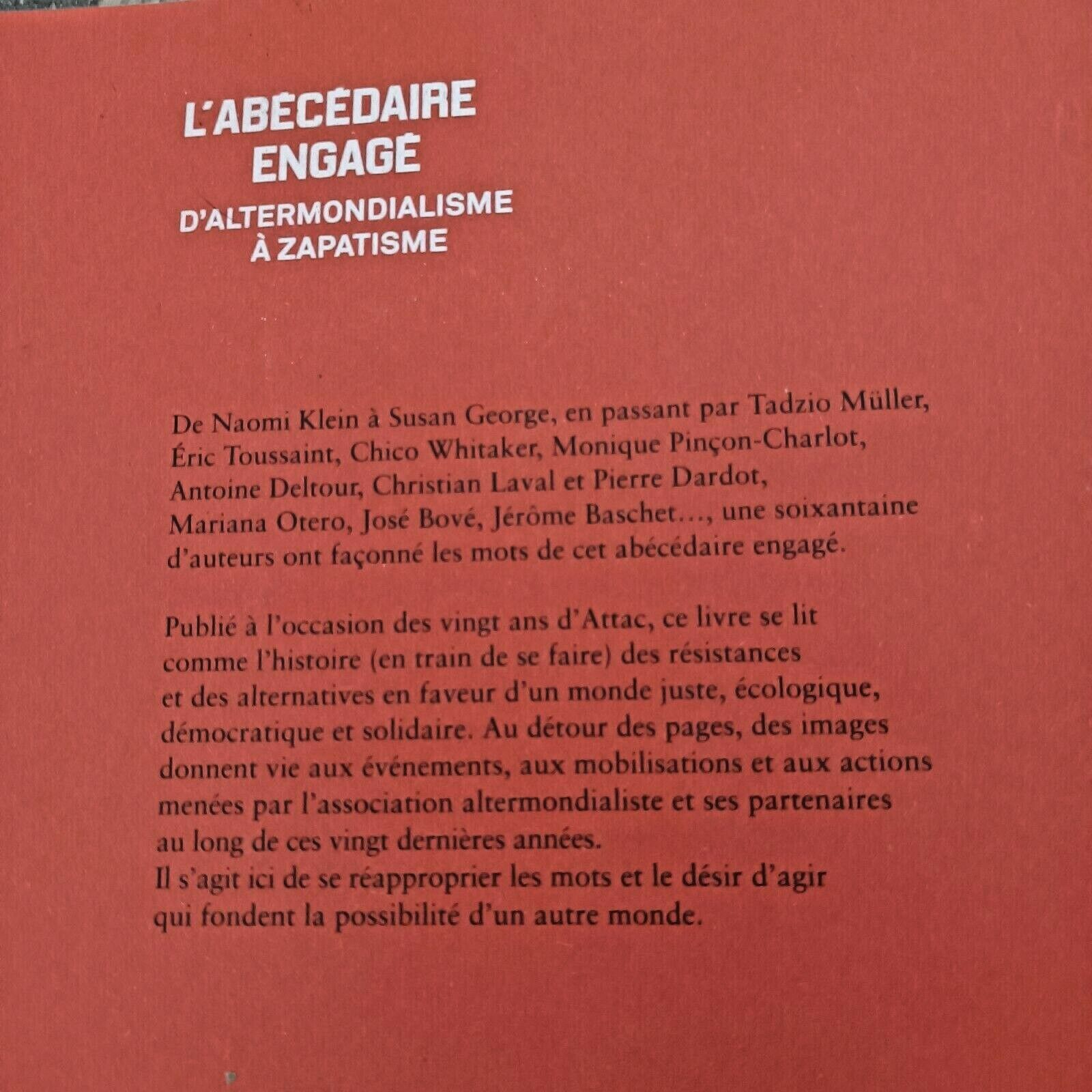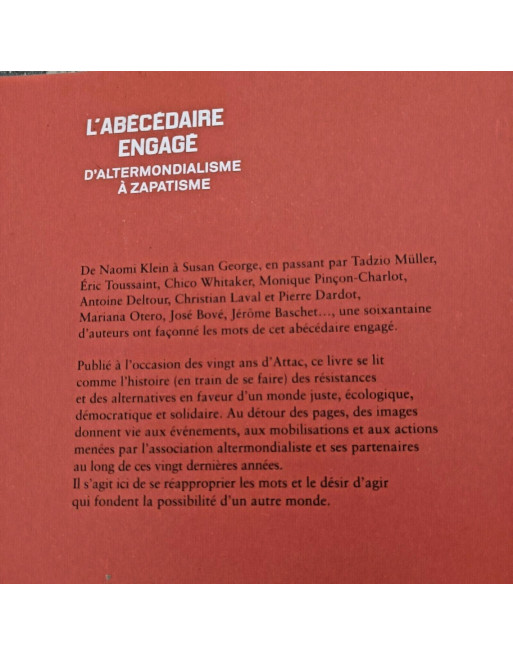 Pour les 20 ans d'Attac, voici l'abécédaire - d'Altermondialisme à Zapatisme - engagé, qui fait le tour des thématiques clés du mouvement et des combats qu'il a menés. Un ouvrage collectif donc, qui rassemble une cinquantaine de contributions, chacune construite à partir d'un mot clé qui évoque un pan de l'histoire ou de l'actualité d'Attac. Parmi les contributeurs : Naomi Klein (Climat), Monique Pinçon Charlot (Inégalités), Edwy Plenel (Xénophobie), Susan George (Libre-échange), José Bové (Souveraineté alimentaire) ou encore Usul (Réseaux Sociaux), etc.