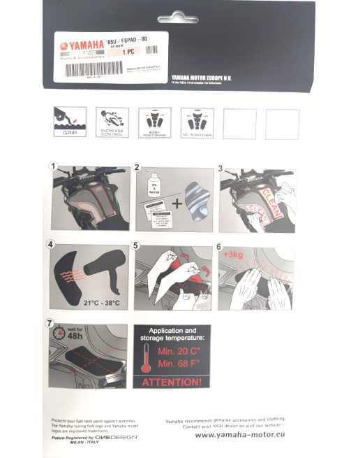 Pads en caoutchouc haute densité à coller de chaque côté du réservoir de la TRACER 9 pour un meilleur grip. Pads qui protègent les flancs du réservoir des rayures et augmentent le confort de conduite.