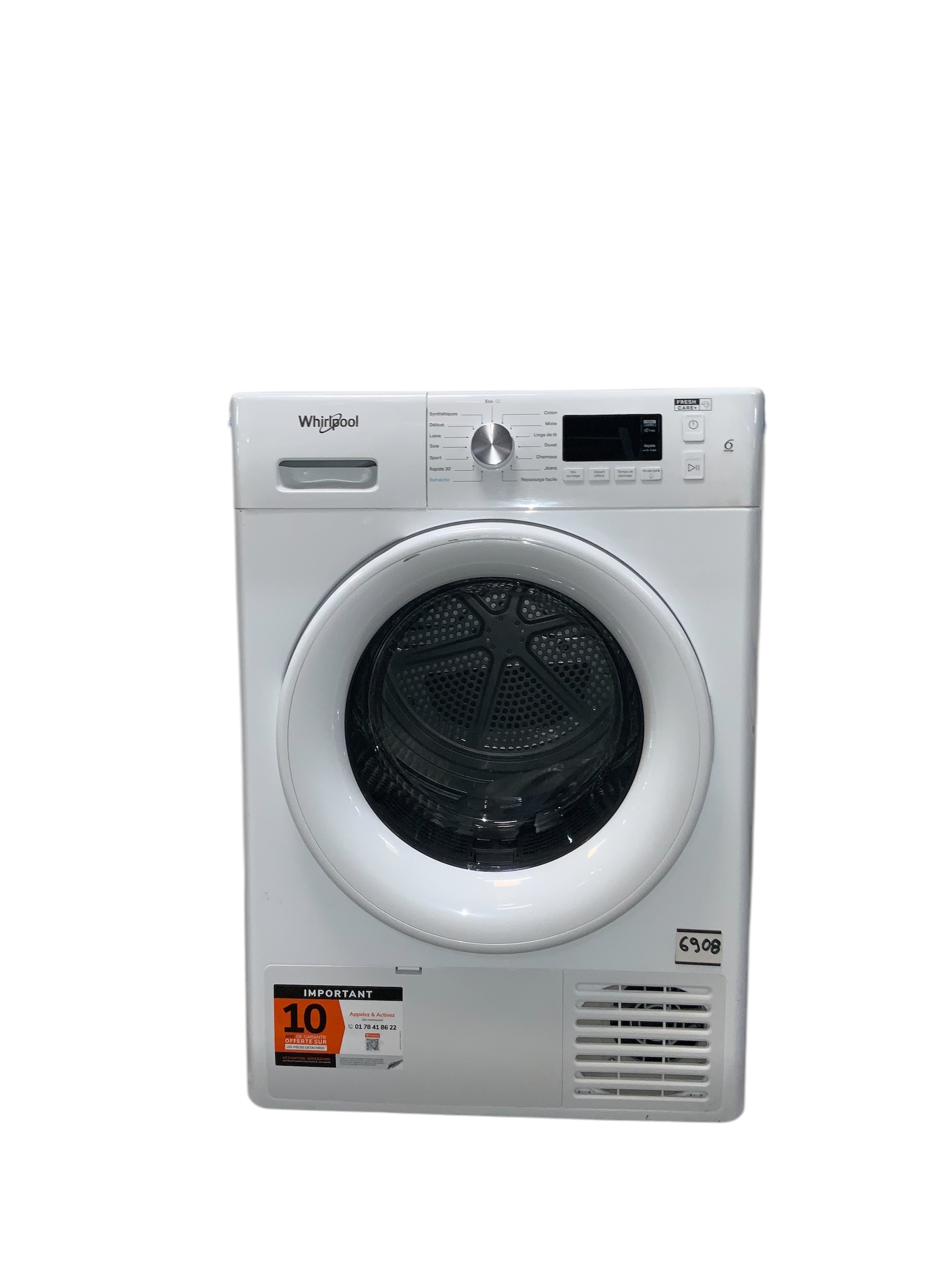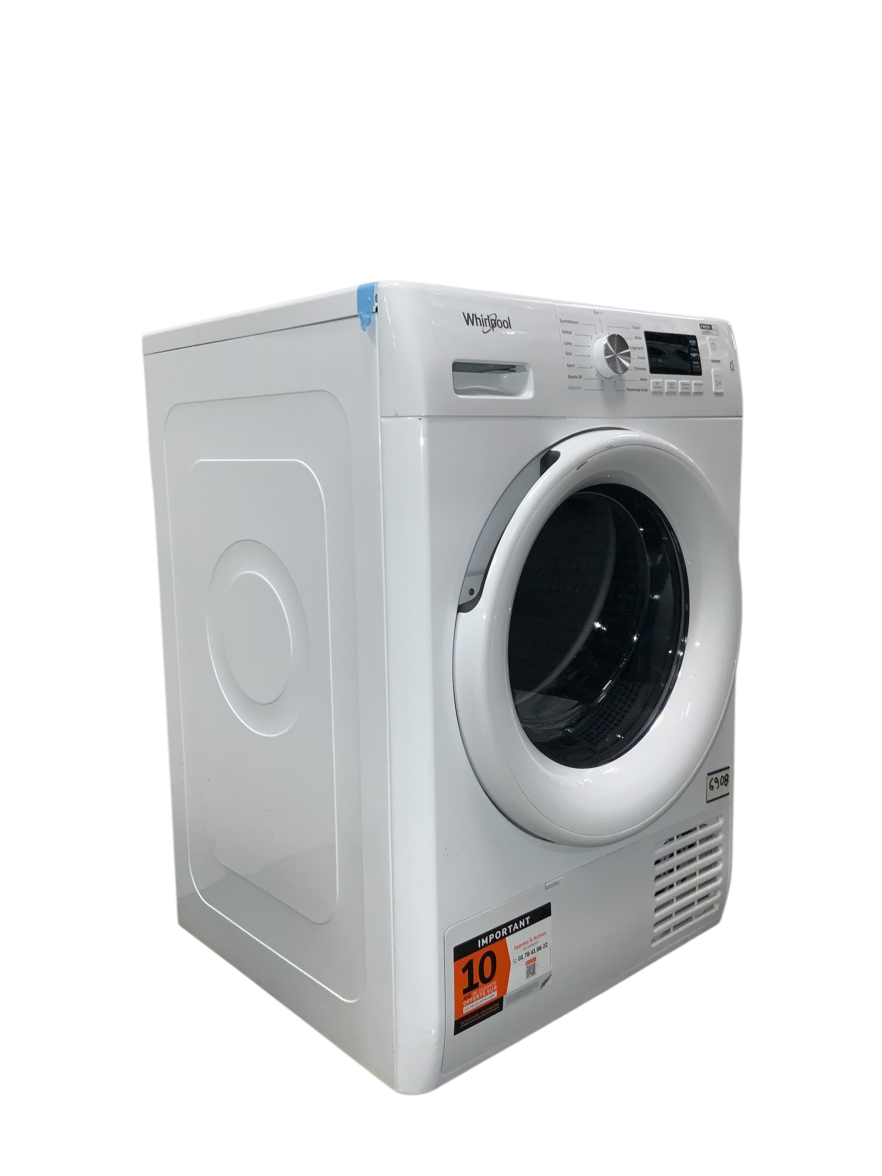 🌟 Sèche-linge Whirlpool FFTM1182FR – Efficacité et Simplicité au Quotidien ☀️ Le Whirlpool FFTM1182FR est un sèche-linge à condensation pensé pour vous offrir un séchage performant tout en prenant soin de vos vêtements. Grâce à sa technologie intuitive et sa grande capacité, il s’adapte parfaitement aux besoins d’un foyer actif. ✨ Caractéristiques principales : • 🔘 Capacité de séchage : 8 kg – Parfait pour les ménages de taille moyenne. • 💨 Type de séchage : Condensation – Pas d’évacuation nécessaire, l’eau est récupérée dans un réservoir. • 🌍 Classe énergétique : B – Un bon compromis entre consommation et performance. • 🧼 Programmes variés : Coton, synthétiques, délicats, mix, repassage facile, séchage rapide et plus encore. • 📊 Affichage digital : Affiche le temps restant et les options choisies. • ⏰ Départ différé : Programmez votre cycle jusqu’à 24 heures à l’avance. 🔹 Confort et sécurité : • 🔇 Fonctionnement silencieux : Pour un séchage discret, même en soirée. • 🔒 Sécurité enfant : Empêche toute modification involontaire du programme. • 🌀 Capteur d’humidité : Ajuste automatiquement la durée pour éviter le surséchage. 📐 Design et dimensions : • 📏 Dimensions (L x H x P) : 59.5 x 84.9 x 64.9 cm – S’intègre facilement dans votre espace buanderie. • ⚪ Couleur : Blanc – Pour un look moderne et épuré. 🔧 Garantie : 1 an pièces et main-d’œuvre incluse. 📌 Avec le Whirlpool FFTM1182FR, profitez d’un sèche-linge fiable, simple à utiliser et conçu pour s’adapter à votre quotidien en toute sérénité. RÉF ; 6908