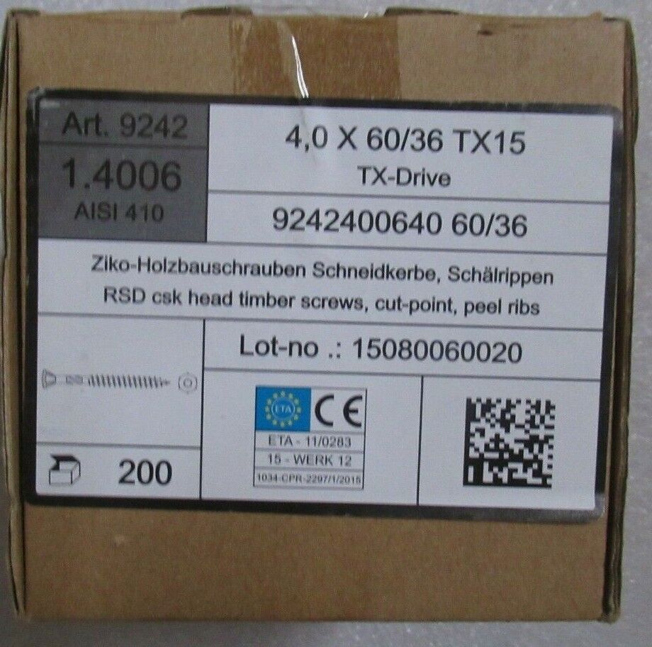 LOT DE 200 VIS A AGGLOMERES 9242400640 1.4006 4,0x60/36 TX15